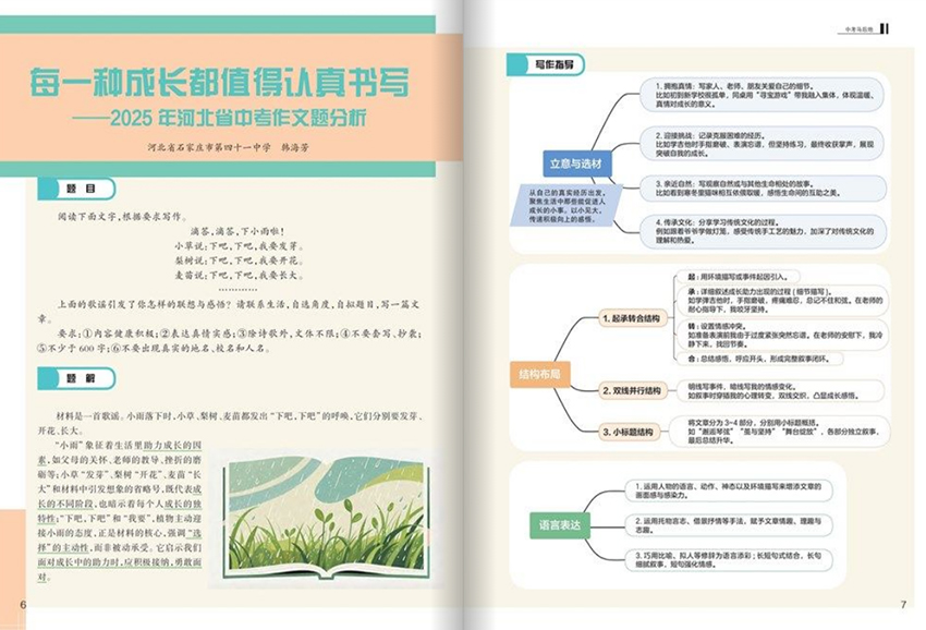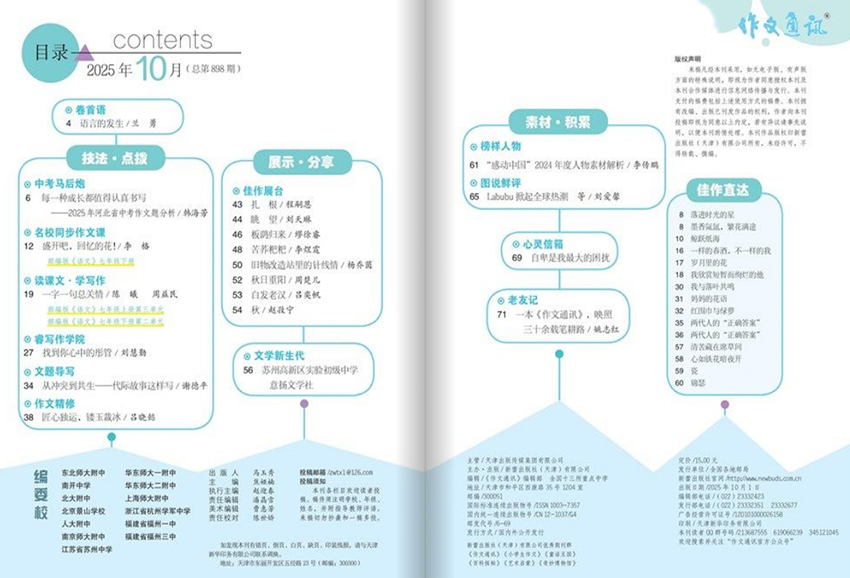 雜志內(nèi)容體系科學(xué)完整,欄目設(shè)置豐富多元。設(shè)有“名校佳作”“考場滿分作文”“寫作技法”“素材積累”“名師講堂”“同題競寫”“病文升格”等經(jīng)典欄目。其中,“名校佳作”精選全國重點(diǎn)中學(xué)學(xué)生的優(yōu)秀習(xí)作,展現(xiàn)不同風(fēng)格與思路的寫作范本;“寫作技法”則系統(tǒng)講解各類文體的寫作技巧,從開頭結(jié)尾到過渡銜接,從語言潤色到論證方法,層層遞進(jìn),循序漸進(jìn);“素材積累”聚焦社會熱點(diǎn)、經(jīng)典名著、歷史人物與科技人文,為學(xué)生提供新鮮、典型、可遷移的寫作“彈藥庫”,解決“無米下炊”的難題。