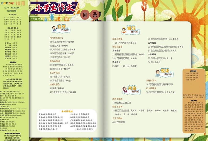 《小學生作文》雜志內容體系科學、層次分明,欄目設置豐富多樣,極具針對性與實用性。設有“佳作展臺”“名師點評”“寫作小錦囊”“同題競寫”“好詞好句積累”“病文升格”“趣味練筆”等經典欄目。“佳作展臺”精選全國各地小學生的優秀習作,題材廣泛、語言生動、情感真摯,為同齡人提供可學可仿的寫作范本;“名師點評”邀請一線特級教師、教研員對作文進行逐段分析,點明亮點、指出改進方向,幫助學生理解“好作文”的標準;“寫作小錦囊”則以通俗易懂的語言,講解審題技巧、結構安排、細節描寫、開頭結尾等實用技法,讓孩子“一學就會,一用就靈”。