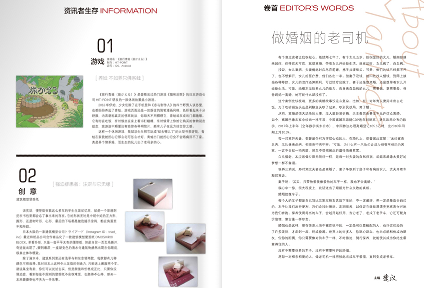 雜志的體裁豐富多樣,融合了人物專訪、情感故事、生活方式記錄、實用指南與社會觀察,既有深度,也不失溫度。它用平實而有力的語言,講述普通女性的不凡經歷,讓每一位讀者都能在其中看到自己的影子,也看到前行的方向。