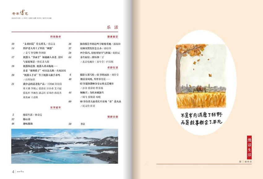 《老年博覽》在提升生活質(zhì)量方面,雜志內(nèi)容涵蓋文史、情感、旅游、心理、家庭關(guān)系等多個(gè)維度。《往事漫憶》《文史長(zhǎng)廊》《人物寫真》等欄目帶領(lǐng)讀者重溫歷史、感悟人生,激發(fā)對(duì)生活的熱愛;《雜談隨想》《快樂生活》則關(guān)注當(dāng)下的精神世界,鼓勵(lì)老年人培養(yǎng)興趣愛好,參與社會(huì)活動(dòng),保持樂觀心態(tài)。此外,雜志還介紹國內(nèi)外適合老年人的旅行方式、新型養(yǎng)老模式和科技產(chǎn)品,如“泡泡帳篷旅館”“智能健康監(jiān)測(cè)設(shè)備”等,拓寬視野,擁抱新時(shí)代的生活方式。
