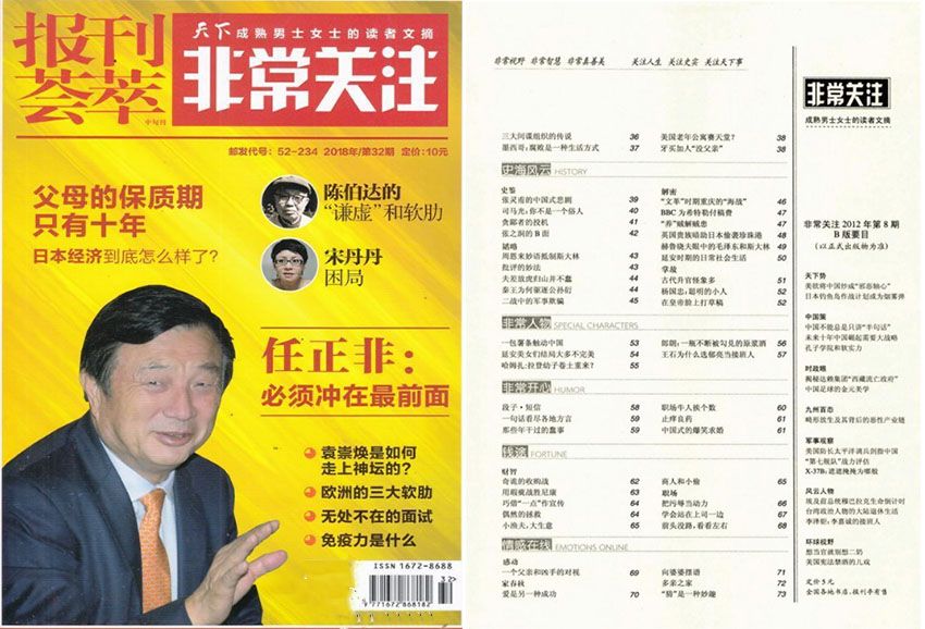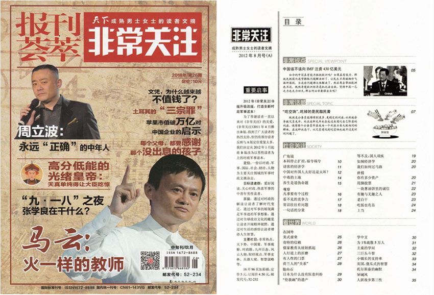 全年一共12期,月刊,單期112頁,彩色銅版紙。出版單位:報刊薈萃.非常關注雜志社
