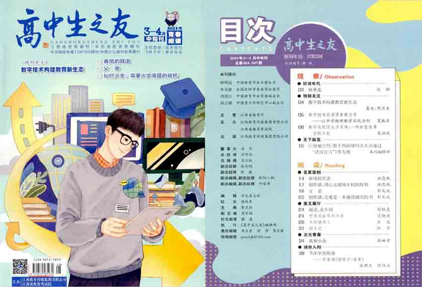 該雜志的主要內容涵蓋了學科學習、文化藝術、科技交流、社會新聞、青少年心理健康等多個方面,特別注重高中生群體的學習和情感需求,秉承啟迪高中生眼界,提高高中生素質的雜志宗旨,引導讀者積極地探究學科知識、把握時代潮流、關注國家重大治理議題、構建自己的成長體系、增進交流與理解,幫助高中生樹立正確的人生觀和價值觀,面向未來做好準備。