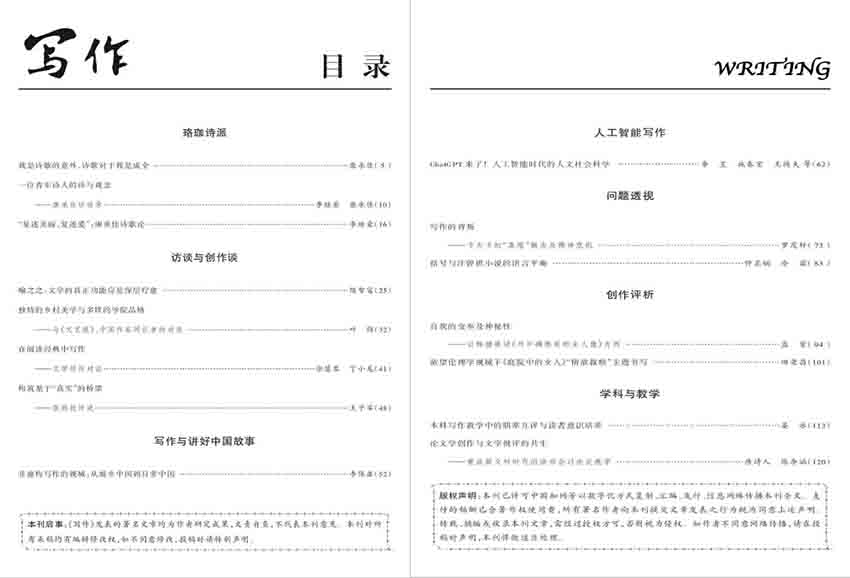 《寫作》為國內(nèi)外公開發(fā)行的國家級核心期刊,現(xiàn)已出版436期。作為寫作學(xué)科核心期刊的《寫作》雜志,自創(chuàng)刊伊始便以“普及寫作知識,提高民族素質(zhì)”為己任,以“傳播科學(xué)理論,促進寫作學(xué)研究不斷深入發(fā)展”為辦刊宗旨,用科學(xué)發(fā)展觀統(tǒng)領(lǐng)思想,嚴格篩選、編輯、審定每一篇文章,確保刊發(fā)文章格調(diào)高雅且具有較高的學(xué)術(shù)性,是一本集學(xué)術(shù)性和實用性于一體的雜志。近年來《寫作》雜志在既定辦刊方針的指引下,不斷挖掘、拓展欄目的內(nèi)涵和外延,使《寫作》雜志的內(nèi)容更顯豐富和立體化。