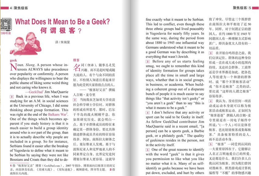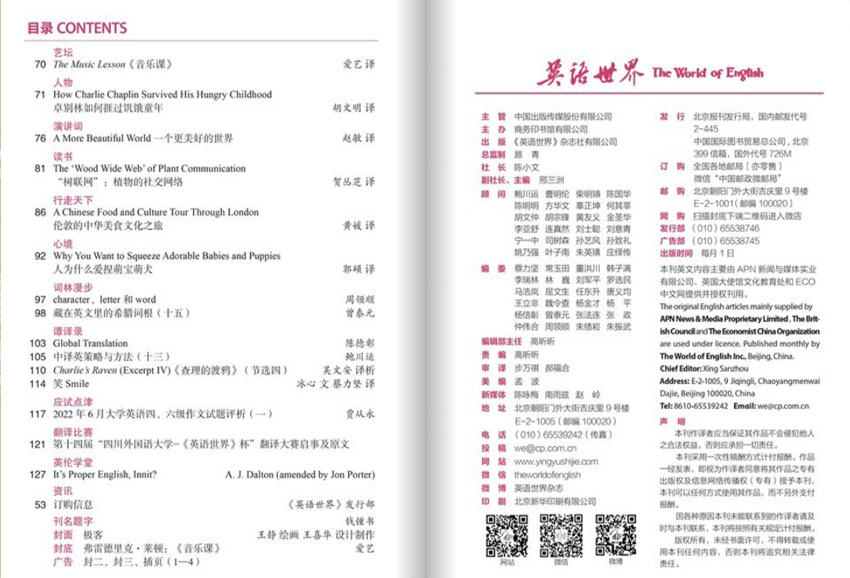 選擇優(yōu)秀的英語小說、詩歌和短篇文章,幫助讀者提高閱讀的能力和英文表達(dá)的能力。介紹英語世界中有影響力的學(xué)術(shù)類及一般圖書,讓讀者了解最新熱門的英語書籍。該雜志還有分類廣告欄、讀者來信、英語語言學(xué)習(xí)技巧、英語演講和演畫等欄目。