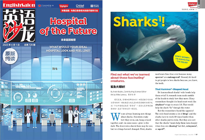 《英語沙龍》主要欄目:HIGHLIGHTS、SOCIAL STUDIES、CRICKET、AMERICAN CAMPUS、BRITISH COUNCIL等。
